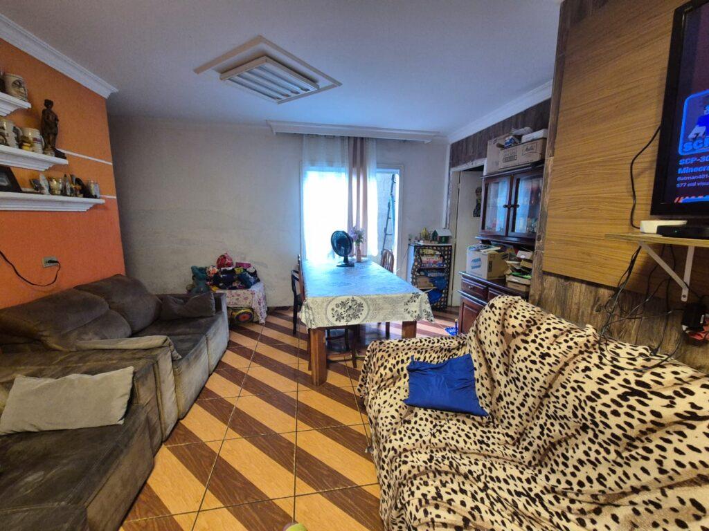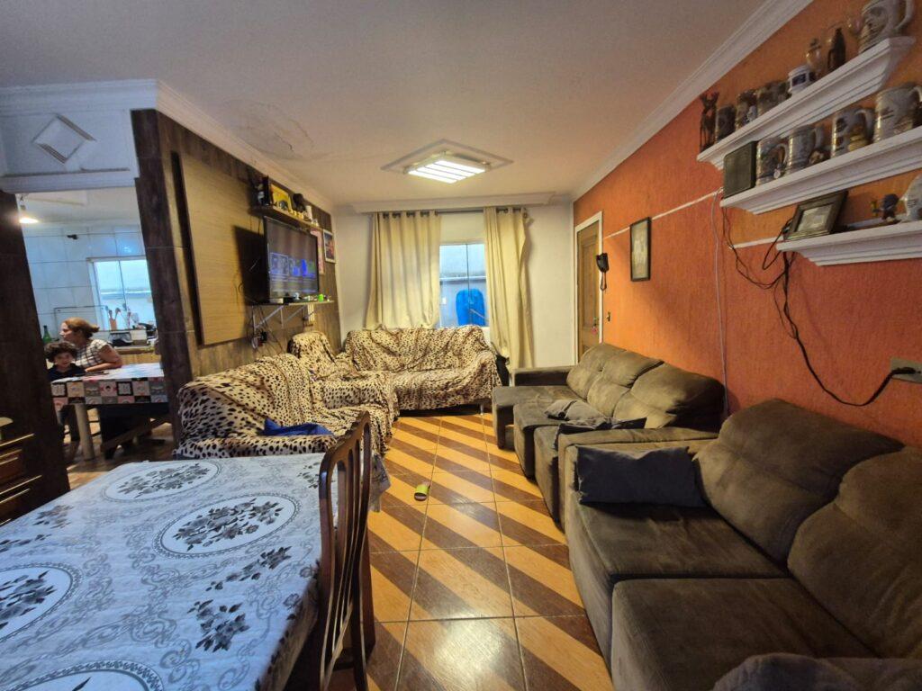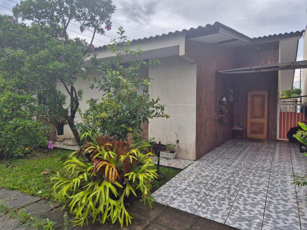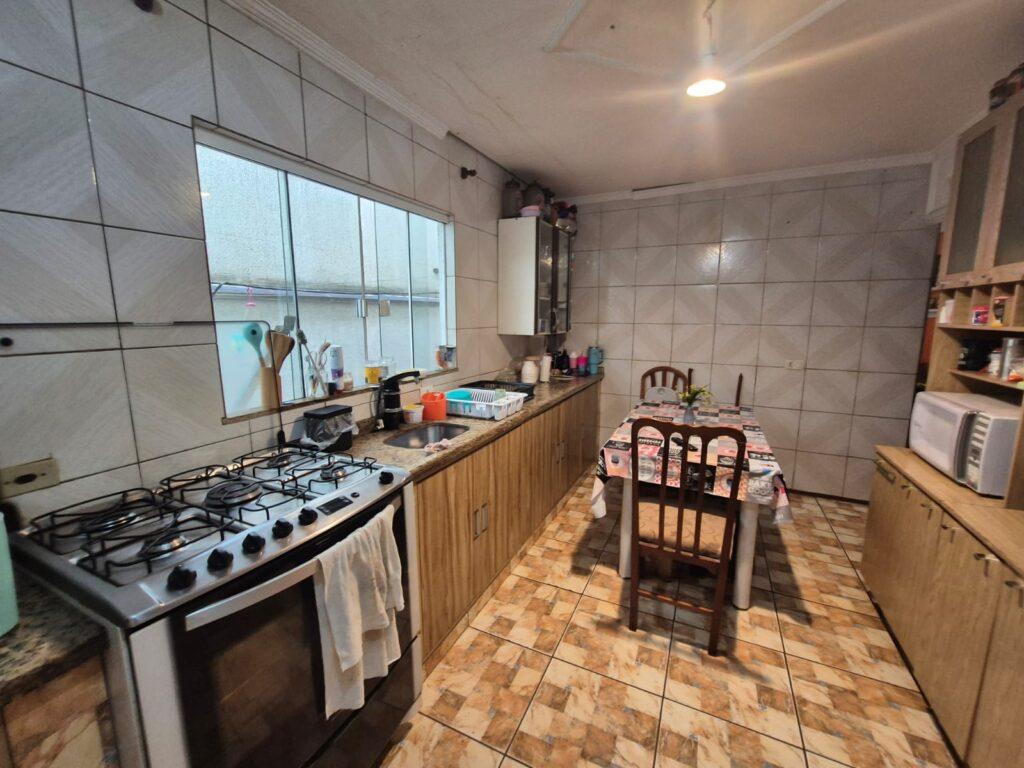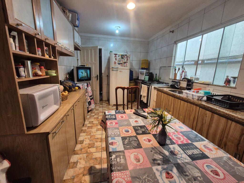 Conta com garagem para 2 veículos, sala de estar e jantar, cozinha, área de serviço e churrasqueira.